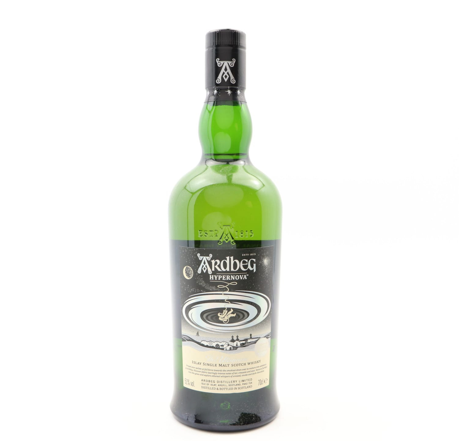 From the historic Ardbeg Distillery, established on Islay in 1815, comes Hypernova, a whisky renowned for its intensely smoky character. This expression pushes Ardbeg’s signature style to new limits, boasting phenol levels exceeding 170 ppm and delivering a powerful, stellar burst of flavour. Expect a complex profile of tarry smoke and soot, beautifully balanced by underlying citric sweetness and a rich, oily texture. Matured exclusively in American Oak casks and bottled in May 2022 at 51% ABV, Hypernova represents a bold exploration of Islay’s peatiest traditions.